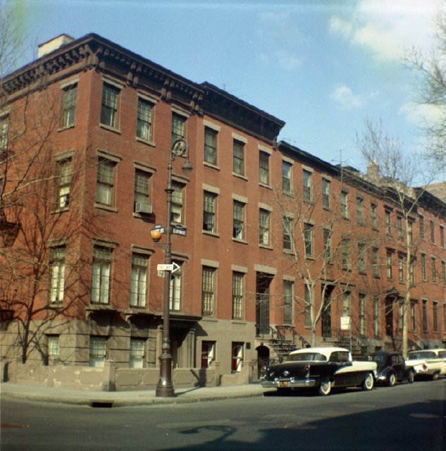 1960 photo – west side of Clinton Street looking north from State Street. 182 Clinton is one house in from the corner, with the ’55 two-tone Oldsmobile parked out front. Source: John D. Morrell photograph collection at Center for Brooklyn History.