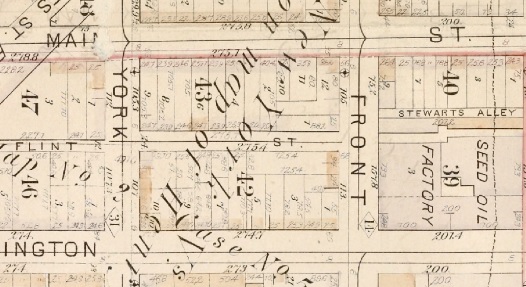 In 1837 the block between York and Front Streets was slightly widened, and both blocks legally renamed Stewart Street, but unofficially some people still called it Stewart’s Alley. To muddle matters further, by the 1850s, a tiny passageway had been opened up on the block north of Front Street, between the Campbell & Thayer Linseed Oil Factory complex and the rear yards of houses on Main Street. This passage was only roughly opposite the end of Stewart Street, but it too was given the name Stewart’s Alley.