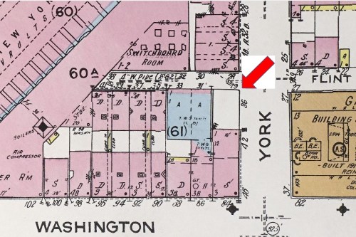 This 1939 Sanborn map shows the direction of the painter’s viewpoint — looking southeast.  The white space at the corner of the block is the empty, fenced-in lot at the foreground of the painting: