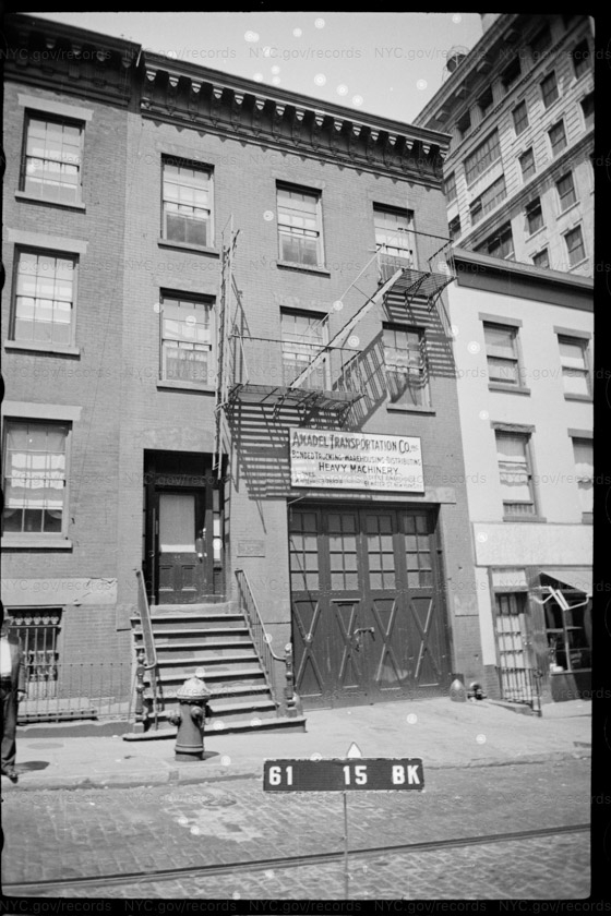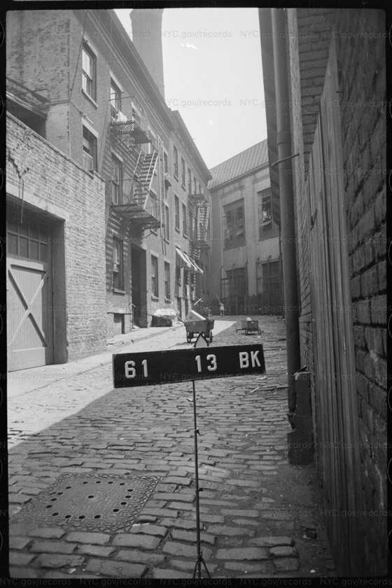 This NYC Municipal Archives tax photo (c. 1940) is looking south down Flint Street from York Street, showing the dead end at the Brooklyn Bridge. This would be just out of the right side of the frame in Miklos Suba’s painting: