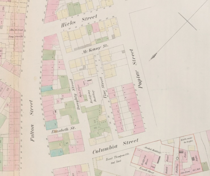 McKenny Street is (mostly) parallel to, and one block to the west of, Hicks Street, in the oldest part of Brooklyn Heights that grew out of the Fulton Ferry Landing area. McKenny originally ran 2 short blocks from Doughty to Poplar Streets. Since the 1950s when the BQE obliterated several blocks around Squibb Hill in the far northwestern corner of the Heights, McKenny has run only from Doughty to Vine Streets.