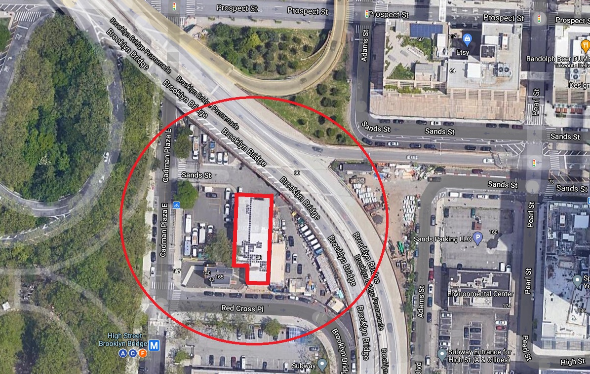 (Another interesting fact evident only from the satellite view – Sands Street actually has a tunnel under the Brooklyn Bridge ramps that today connects the two-city owned parcels on either side. You can see the roadway plates for the overpass in the photo.)