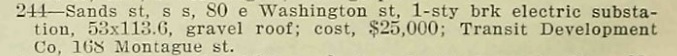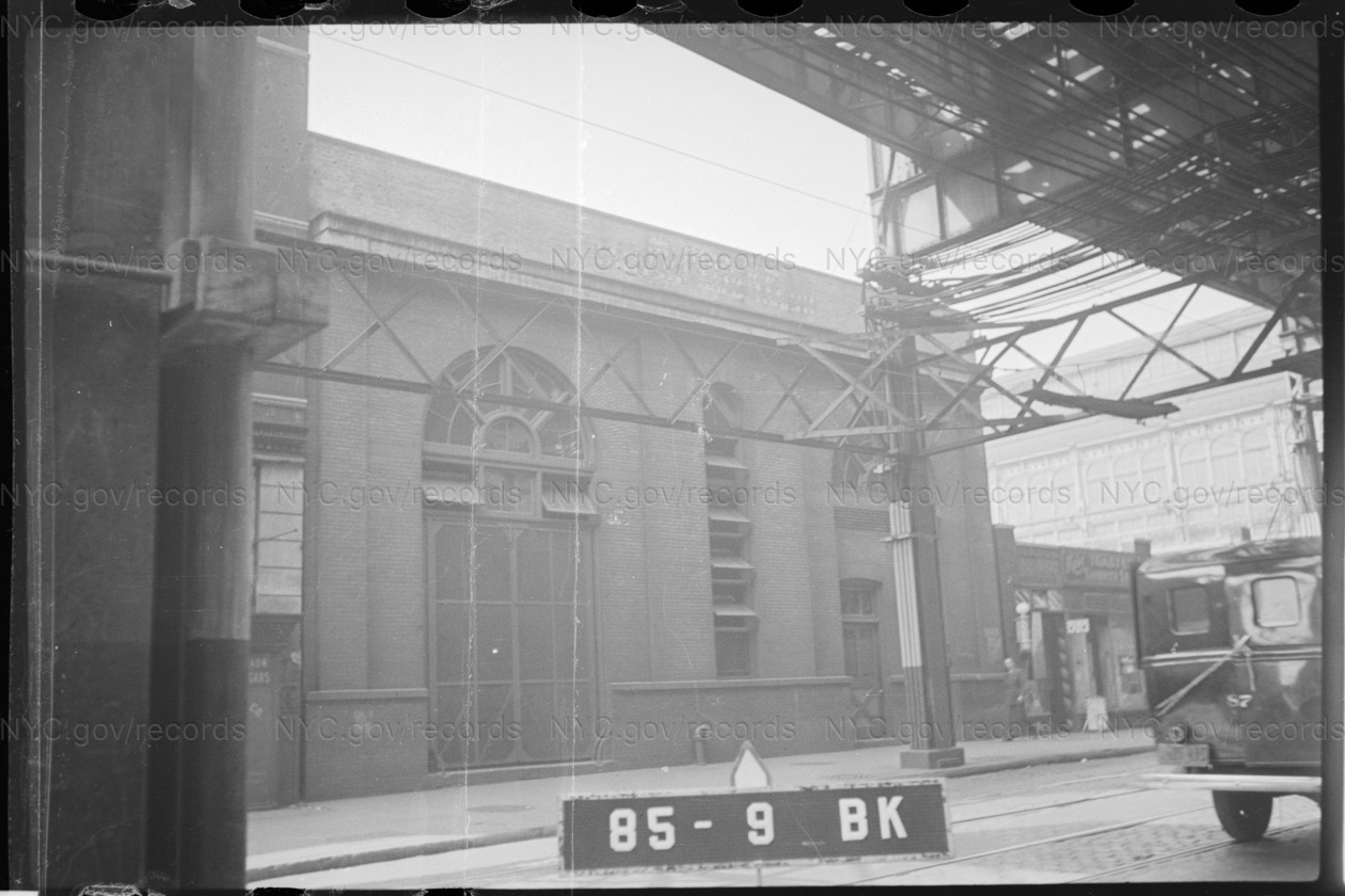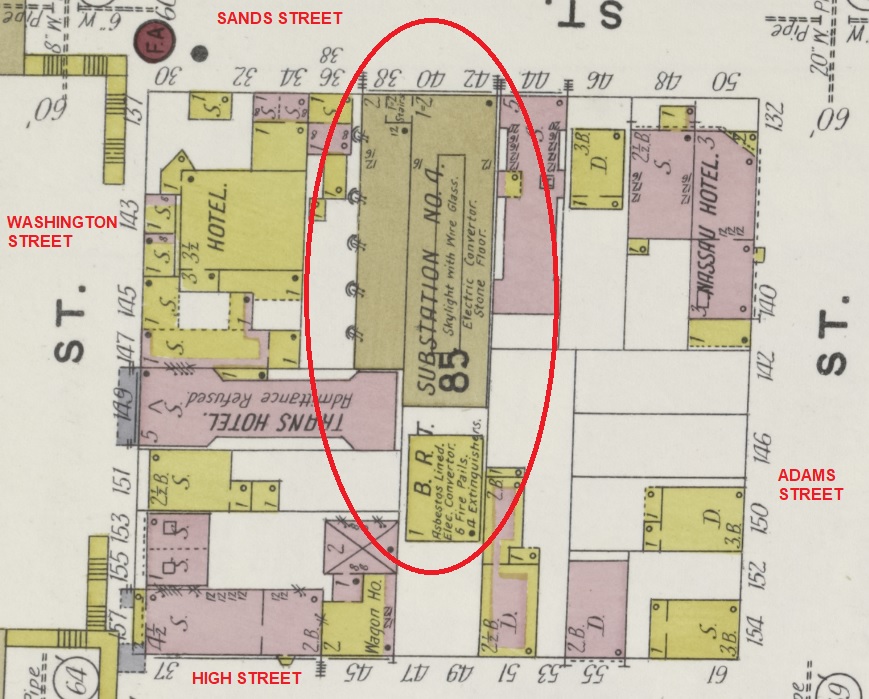 You can see some good pics of the substation building and its notable arched windows in the c.1940 tax photos from the Municipal Archives. (The Municipal Archives didn’t figure out the substation address when it put up its digital archive, but according to the Sanborn map, it would’ve had the range 38-42 Sands Street, and the newspapers referred to it as No. 42 Sands.)