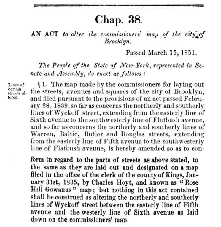 A bit more searching in google on “Rose Hill” and “Charles Hoyt” led to this hit: an act of the New York State Legislature approving alterations to the City of Brooklyn’s street map. 1851 is when the government actually changed the official Brooklyn maps to match the reality on the ground. The city simply changed the map’s locations for Warren, Baltic, Butler & Douglass Streets, east of Fifth Avenue. The city’s remapped streets matched Hoyt’s Rose Hill map, instead of continuing their straight course from west of Fifth Ave as originally mapped by the city. (Keeping in mind this is before the street NAMES east of Fifth Ave were also changed, which happened later and for completely unrelated reasons.)