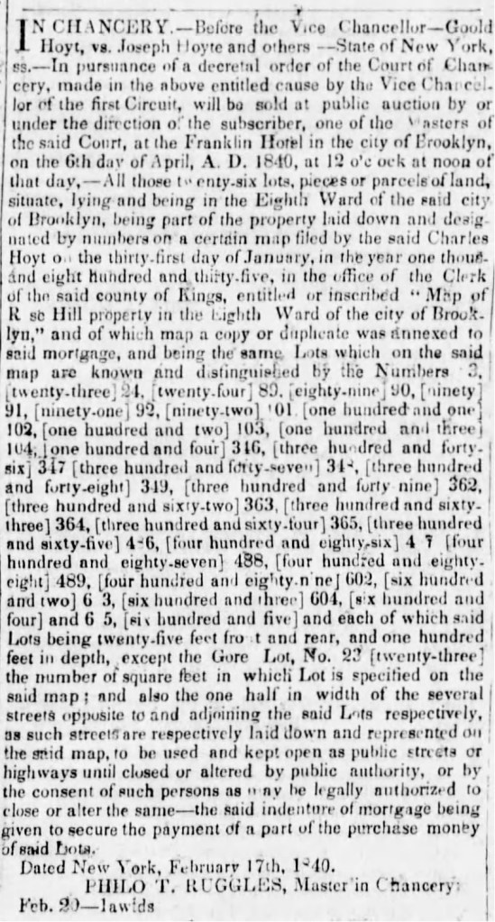 Further searching on the term “Rose Hill” itself in the Brooklyn Daily Eagle archives led me to some earlier hits in 1840 referring to the 1835 subdivision map, mentioning that it had been filed by Charles Hoyt.