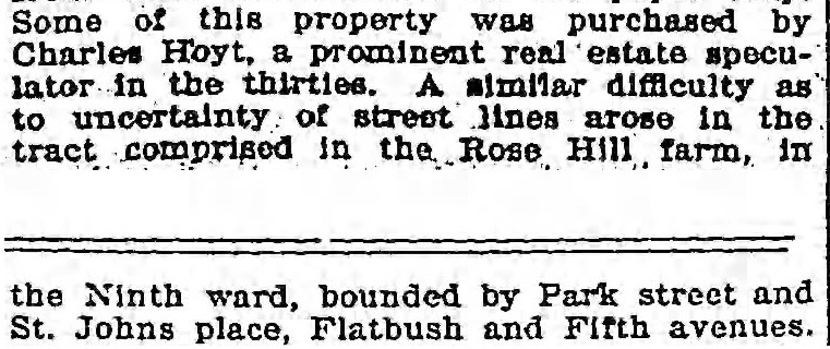 (Hoyt was actually mentioned in the 1896 article too, but as described there, his connection to Rose Hill was ambiguous. It did say he was a “a prominent real estate speculator in the thirties,” which I already knew from researching his transactions in Brooklyn Heights. Hoyt Street is named after him.)