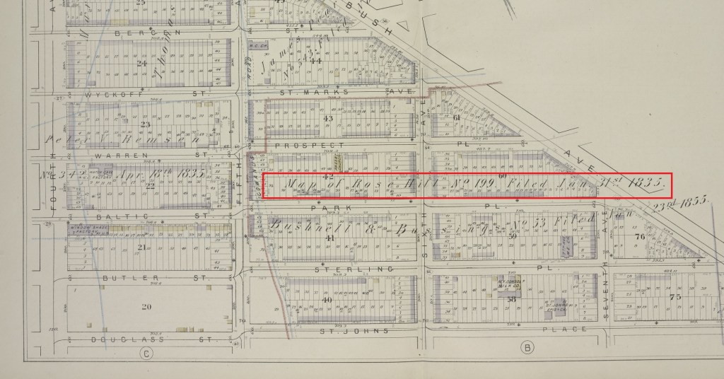 So looking at Vol. 4, Plate A in the Hopkins Old Farm Line Atlas, we see Park Slope’s four oddball dog-leg streets. The map’s 1880 date doesn’t tell us anything new. But notice how the four streets are all within the boundaries of something labeled “Map of Rose Hill No. 199 Filed Jan 31st 1835” – that’s the next clue.