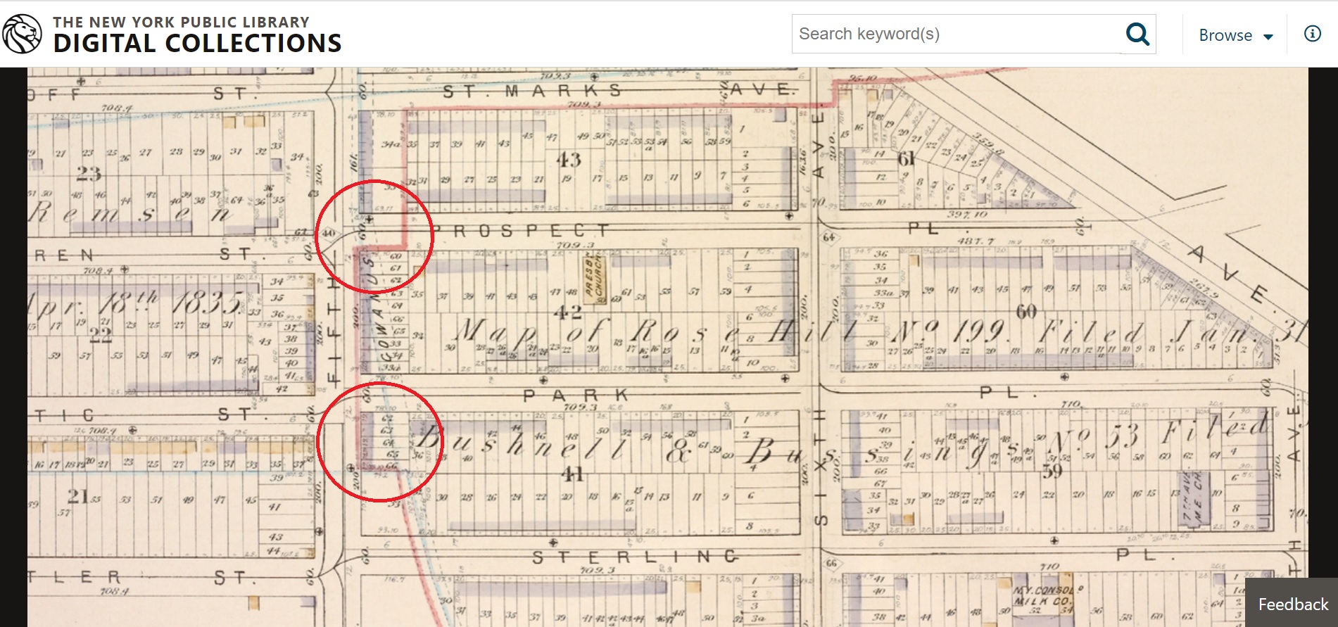 So a farm line atlas is usually the right place to start for this kind of puzzle. My contact sent me an image from Bromley’s 1880 “Atlas of the Entire City of Brooklyn” which included old farm lines superimposed on the contemporary map.