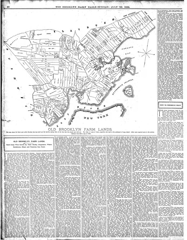 So I consulted another go-source about the old Brooklyn farms – this 1896 article from the Brooklyn Daily Eagle titled “Old Brooklyn Farm Lands.” The Eagle piece was written to commemorate the 50th anniversary of ANOTHER farm line map (the 1846 Butt map which I discuss further down). The article highlights all sorts of interesting factoids and trivia about Brooklyn real estate, neighborhood and development boundaries, and streets.