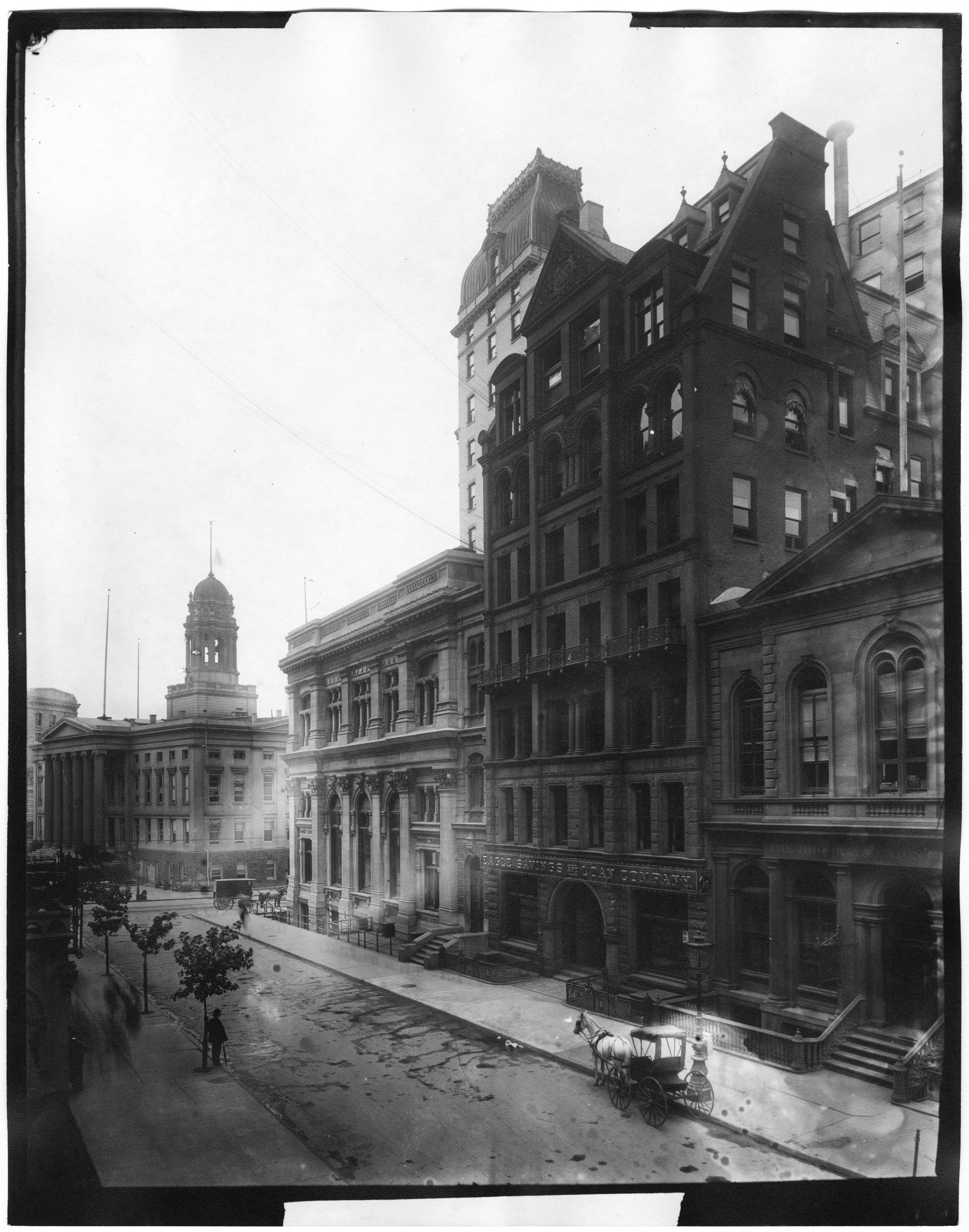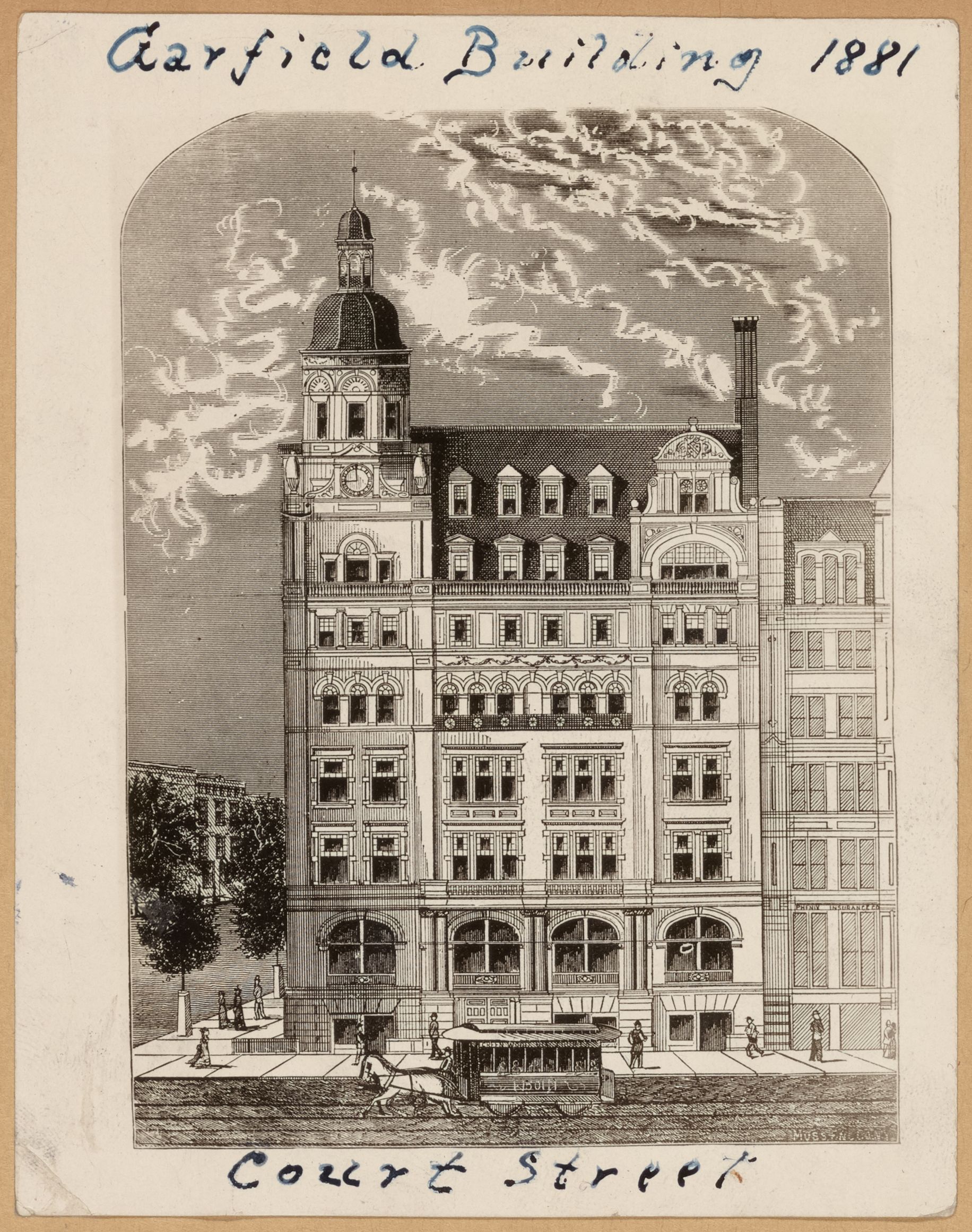 In 1880s, city father A. A. Low (literally: his son Seth was mayor) demolished some Remsen St brownstone houses to make way for his 7-story Garfield Building & 8-story Franklin Building. Though commercial office buildings, each had 8-foot setbacks on Remsen St. The buildings capitalized on the new nexus around City Hall between the Brooklyn Bridge link to Manhattan, and Brooklyn’s upcoming residential neighborhoods farther east and south.
