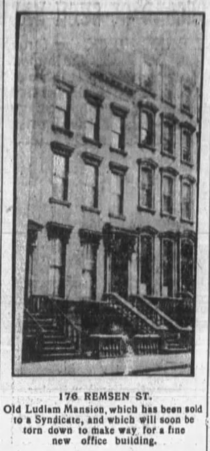 Surveyor Ludlam lived at 176 Remsen St for years. In 1809 his father had founded the firm later known as Bartlett, Ludlam & Dill. They’re still in business today, now known as BLD Land Surveyors. BLD did the survey for Alexico when it tried to buy the St. Francis College campus in 2023 – the site includes Ludlam’s old property!