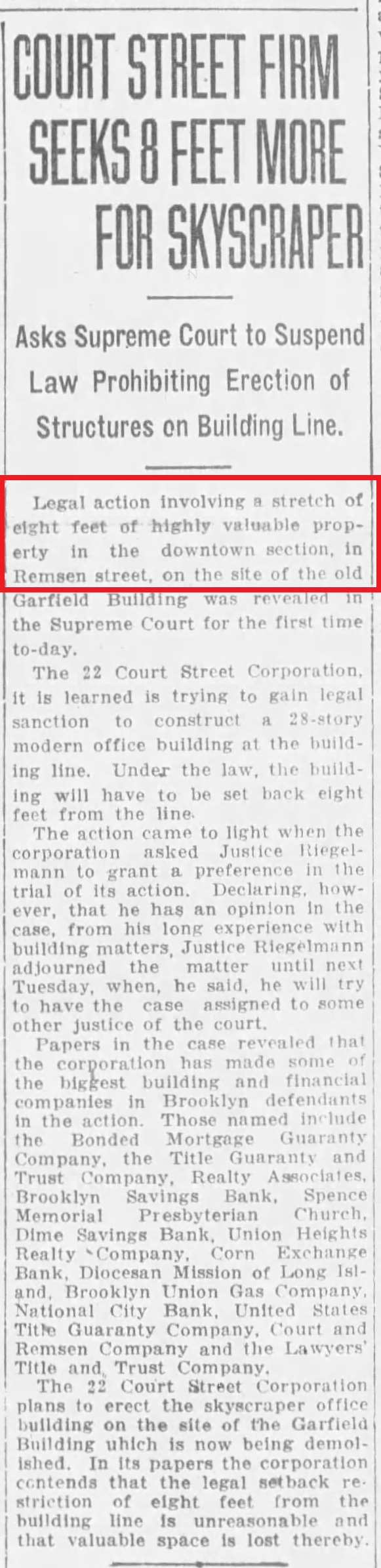Early 1900s developers tried to challenge Remsen St’s 8-foot setback. In lots where the setback was enshrined in the deeds (and not at sites where a setback was mere custom reflected in the as-built conditions), the developers lost. There were separate debates over whether entrance porticos were allowed to be built in the restricted 8-foot space. It was generally understood that ancillary protrusions off the face of a building like columns or even a stoop were allowed. But some developers tried to stretch the definition of what counted as “ancillary.”