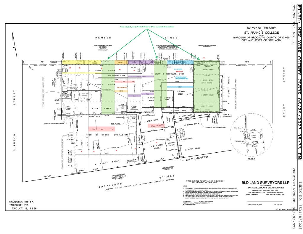 Mapping these restrictive covenants is tricky. Alexico thought the sections highlighted in green on this survey of the St. Francis College campus were unrestricted. (Each section corresponds to the original buildings & their lots that make up the current site.) But evidently Alexico’s title search missed a deed. The leftmost green lot actually has a Harriet Packer restriction from 1866.