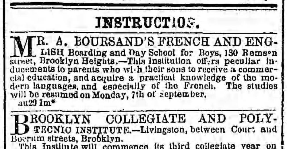 Boursand’s 1857 ad lists the old house number…it was later renumbered as 158 Remsen St in 1870.