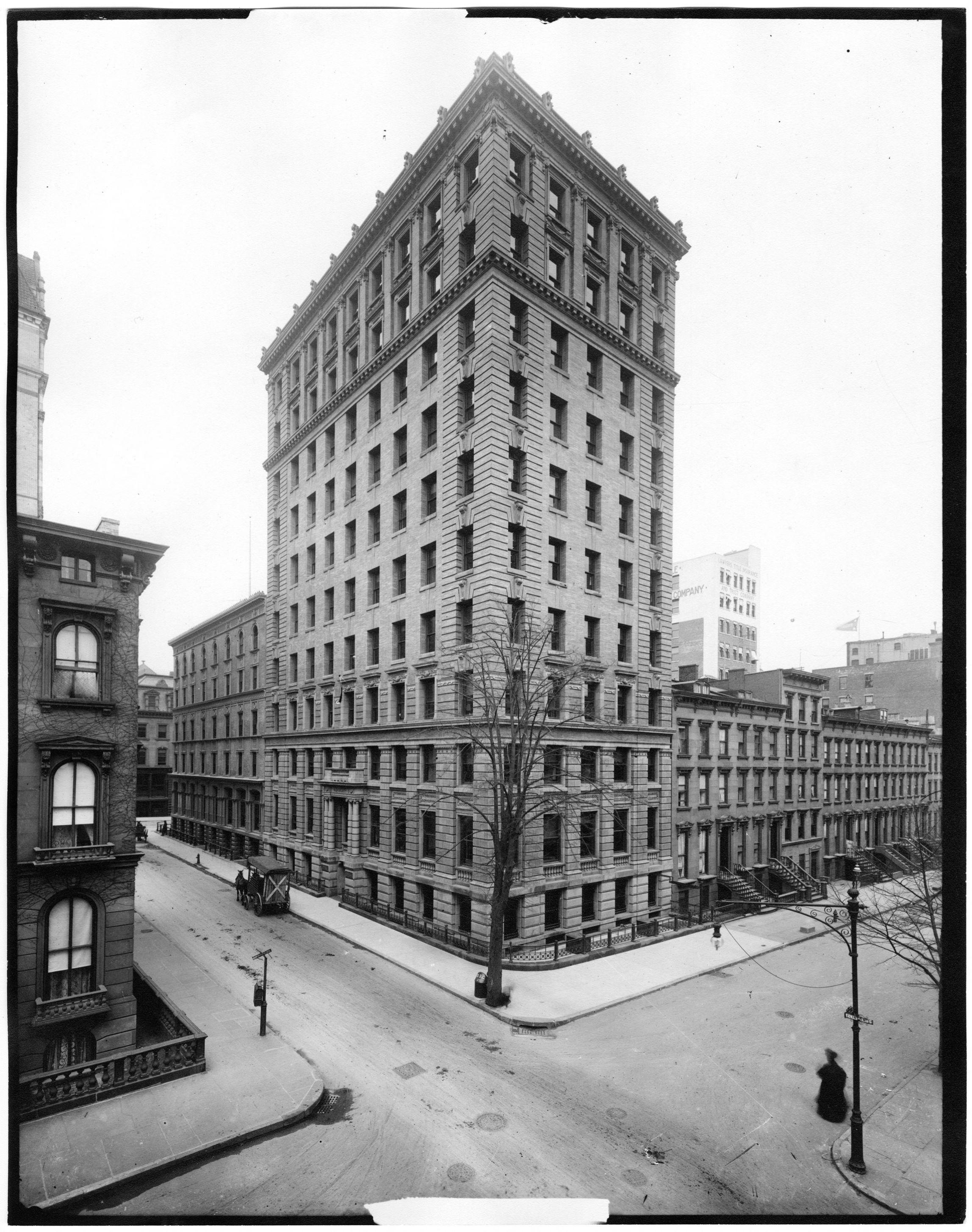Frank Freeman designed 176 Remsen St for the Brooklyn Union Gas Company (BUGCO), c.1914. BUGCO was the successor to the Brooklyn Gas Light Company. Freeman’s building became the central structure in St. Francis College’s former campus. Notice how the architect handled the setback requirement: deep, fenced-in vaults flanking either side of the entrance. This void adhered to the letter to the requirement, which simply prohibited building in that 8-foot space, but not really the spirit, which was intended to provide courtyards or other quasi-public space in front of each original brownstone house. Today the building is landmarked so will remain standing in Rockrose’s redevelopment scheme, 8-foot setback included. (Rockrose’s rendering appears to show the vaults covered and replaced with a landscaped seating area.)