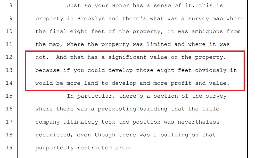 Complicated zoning analysis is required to determine just how much the 8-foot setback really affects future construction at this site. Even if there were no zoning rules, two buildings with the same interior square footage – one with smaller floorplates *due to the setback) but slightly taller, and another with bigger floorplates (if no setback applied) but slighly shorter – aren’t necessarily equivalent in value due to the way the floorplates might be converted into usable space. And on top of that, zoning might restrict the height or other aspects of a building’s bulk, potentially leaving the 8-foot restricted area as a meaningful driver of value reduction. In any case, we do know that Alexico thought the restrictions significantly reduced the site’s $ value – they said so in their legal proceeding with Rockrose and St. Francis College.