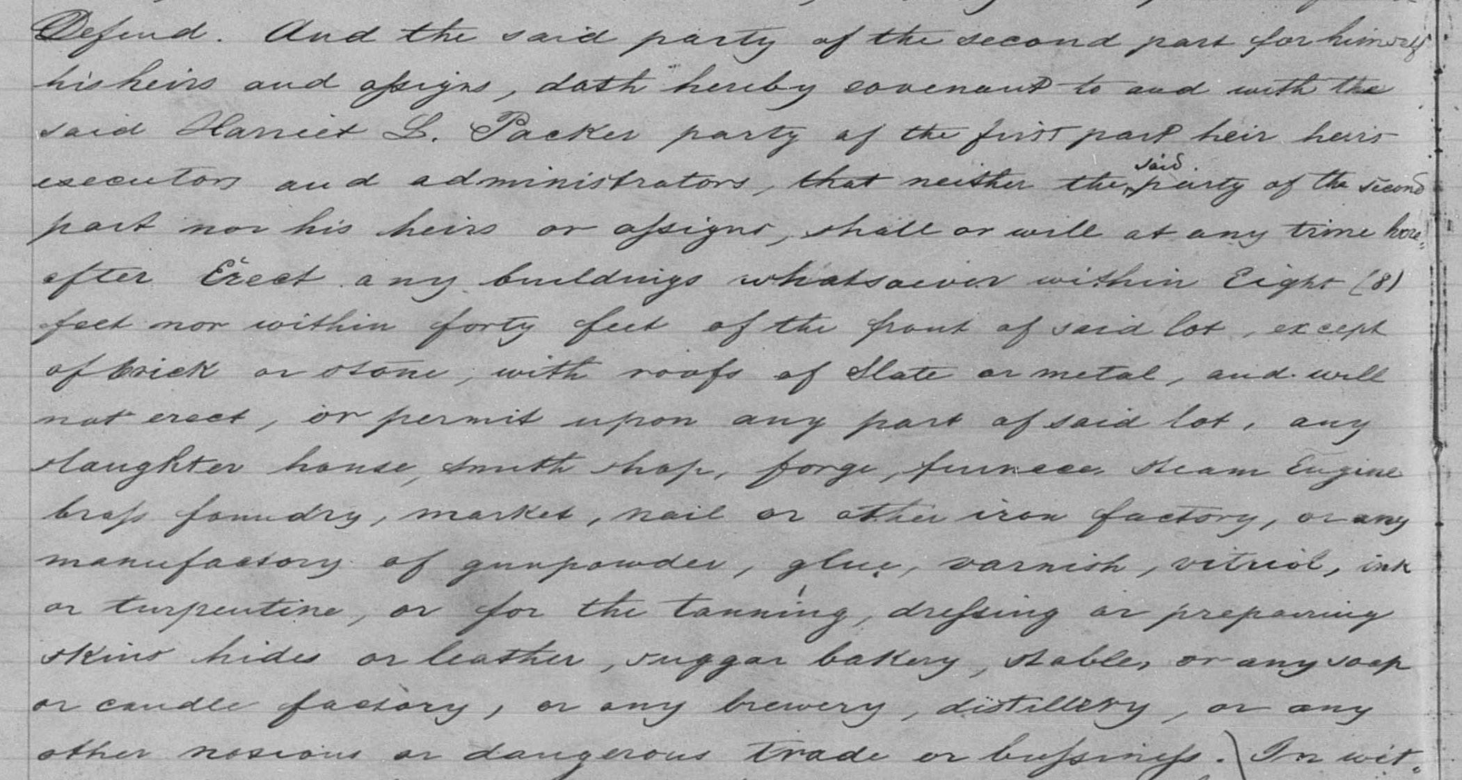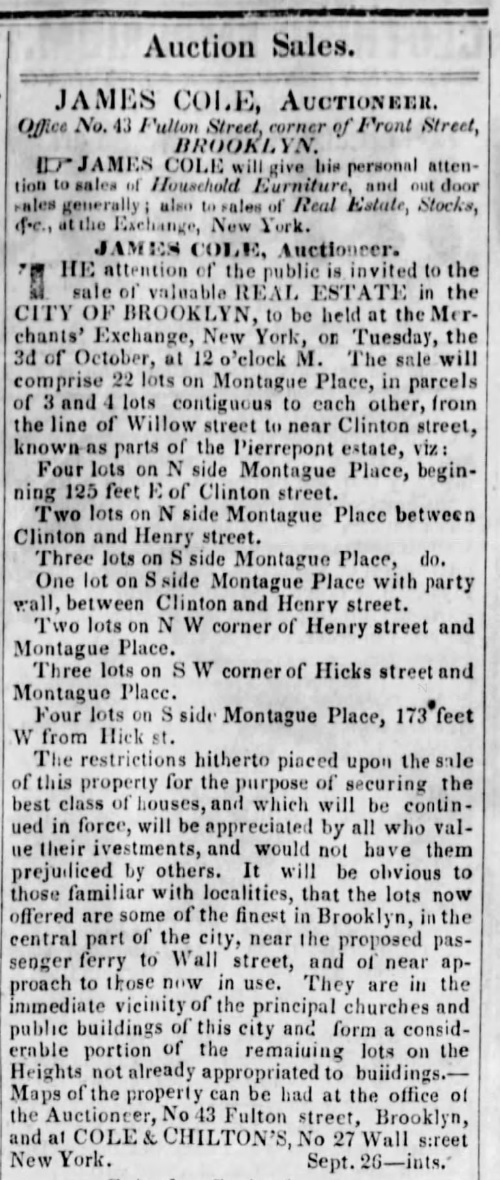 Auction ads for mid-19th century lot sales by the Pierrepont family mention deed restrictions just like Hezekiah’s original ads from the 1820s. Now, however, they’re saying the quiet part out loud as to the restrictions’ purpose: the covenants “will be appreciated by all who value their investments, and would not have them prejudiced by others.”