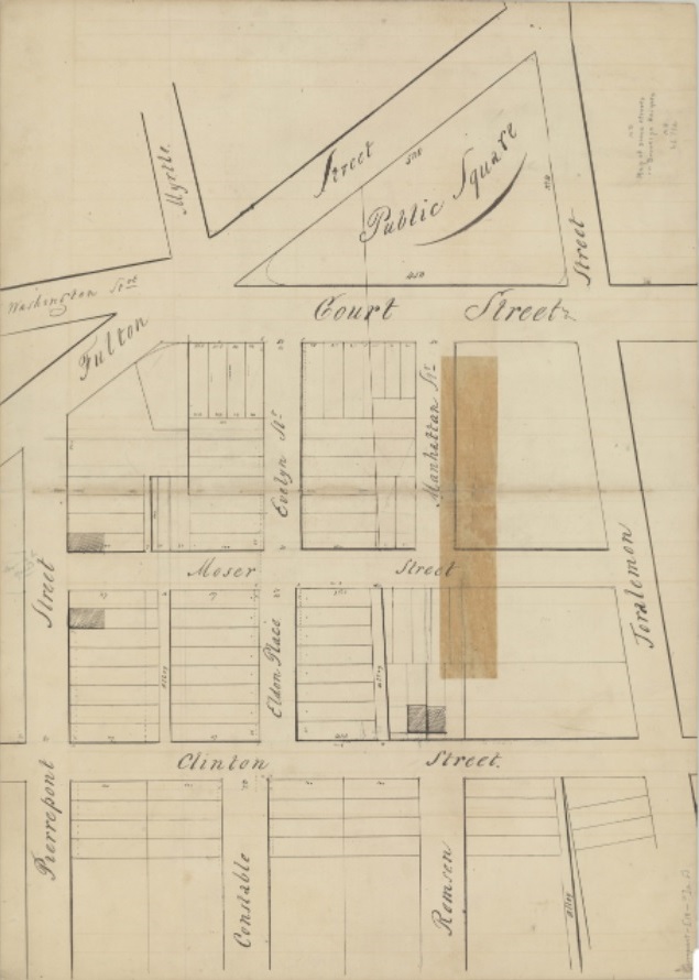 The setting is Remsen Street (between today’s Court and Clinton Streets), and the old St. Francis College campus on the block, now vacant. In this area two hundred years ago, Hezekiah Pierrepont & the Remsen family were still fiddling with maps to lay out streets on their undeveloped land. This block of Remsen St wasn’t even opened yet. Then, Remsen St didn’t run farther east than Clinton St. Instead, proposed streets like Moser, Evelyn, Manhattan, Eldon appeared – on paper. Most of these streets were never opened, or quickly opened and then closed.