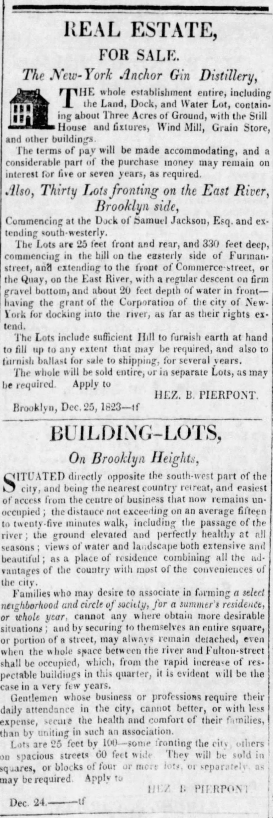 In any case, Pierrepont had a keen eye for how real estate geometry affects value. He certainly did better as a developer than his first Brooklyn venture – the failed Anchor Gin distillery at the foot of Joralemon Street. On the same day in late 1823 when he launched ads for his Brooklyn Heights building lot sales, he advertised he was throwing in the towel on the distillery and offloading it!