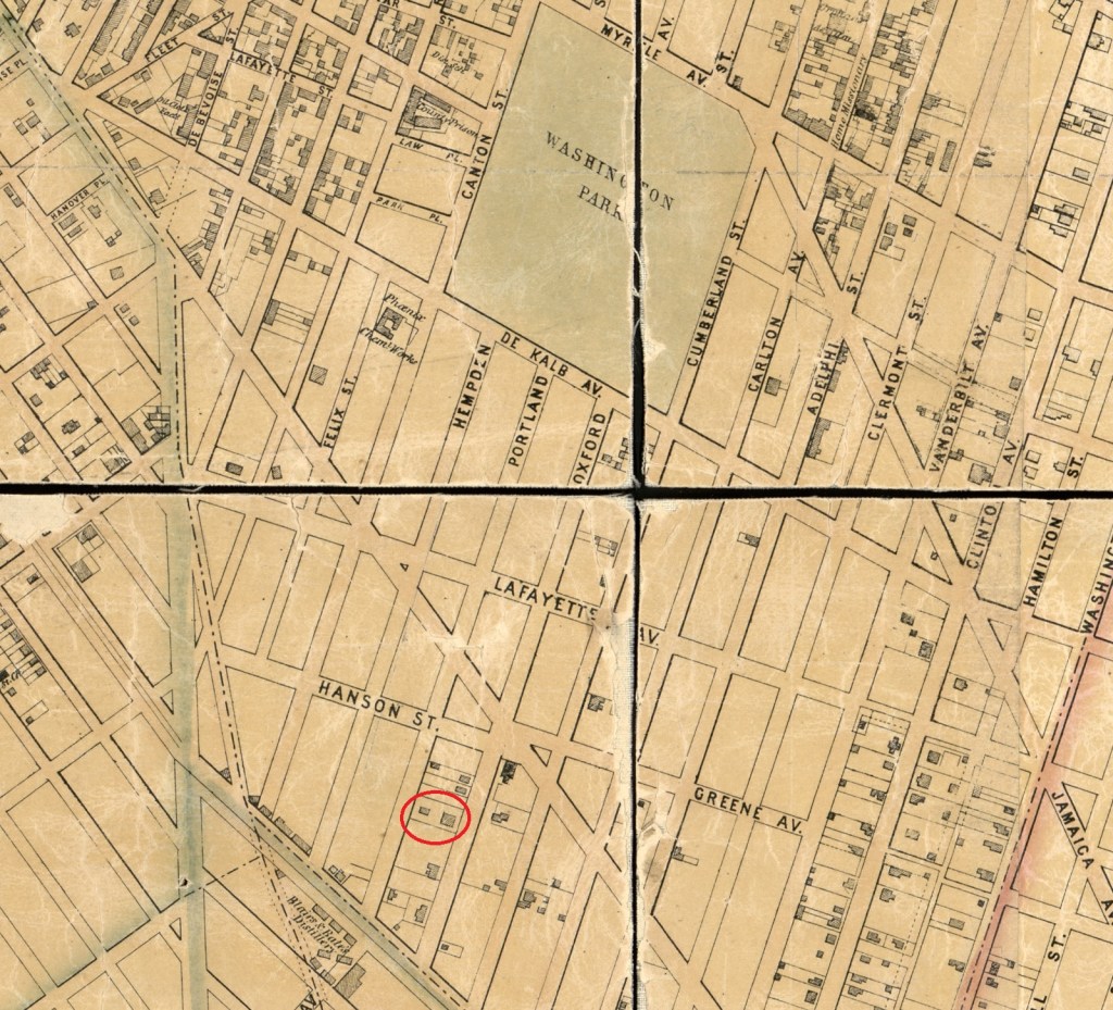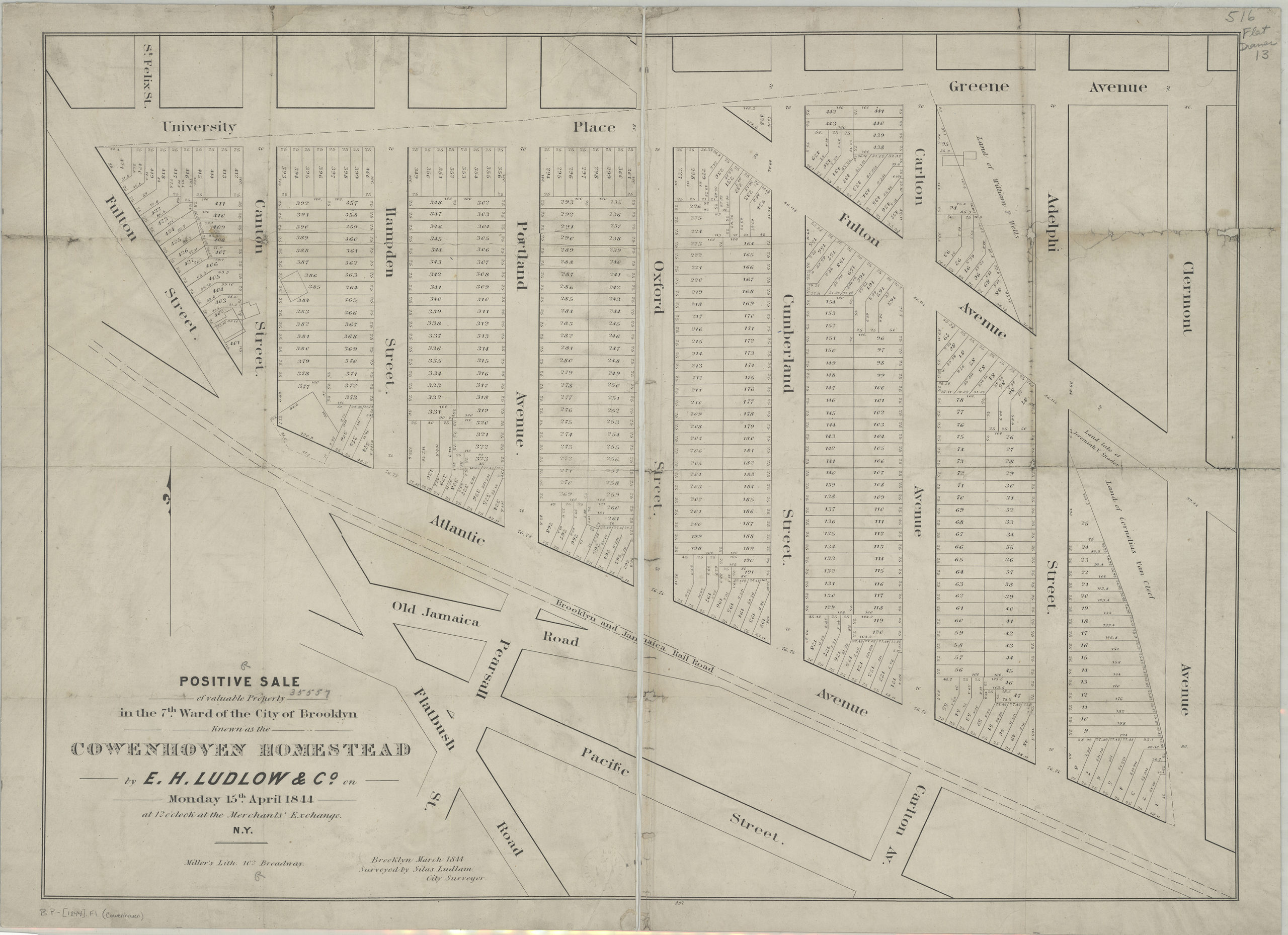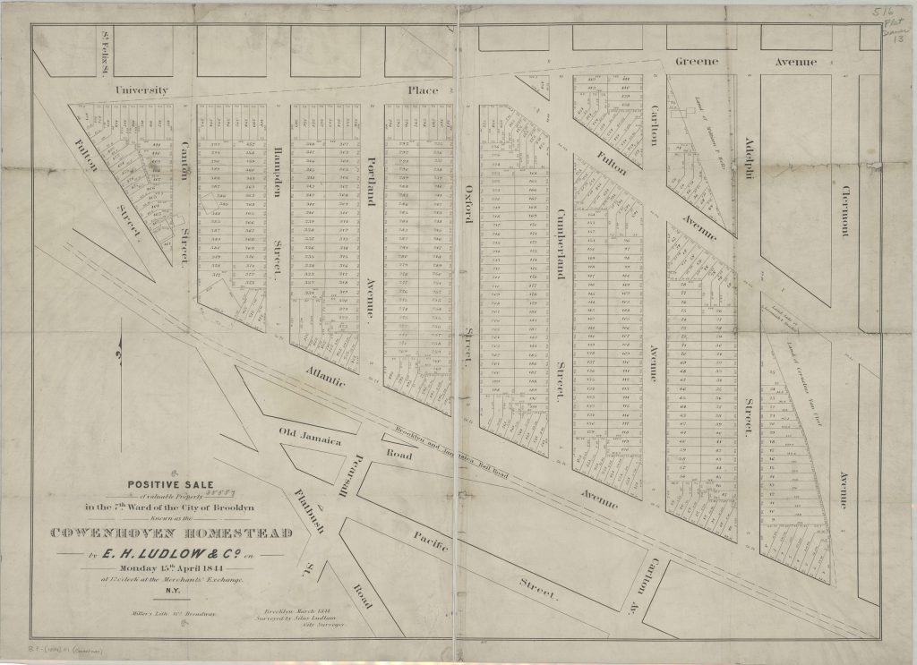 Ludlam’s map divided the homestead into hundreds of 25 feet x 100 feet “city lots.” The map reflects archaic street names like “University Place” which later was renamed Hanson Place. Originally Oxford Street was called just that – not divided like today into “South” and “North” portions divided by the great park in the neighborhood’s center.