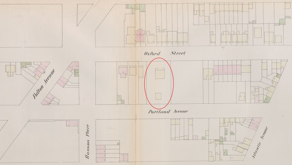 This 1850 map highlights just how few buildings had yet been put up on the old Cowenhoven Homestead; this block was one of the first to be developed. The city’s 1847 directory indicates that Oxford Street, while on paper running all the way from Flushing Avenue to the Jamaica railroad at Atlantic Street, was in fact only open from Fulton to Atlantic.