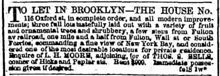 “No. 116 Oxford Street – three full lots tastefully laid out with a variety of fruit and ornamental trees & shrubbery, a few steps from Fulton Av railroad…commanding a fine view of New York Bay, and considered one of the most desirable locations for private residence.”