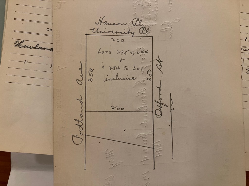 One of Howland’s purchases from the Cowenhoven estate was a group of 28 lots – about two acres – between Oxford Street and Portland Avenue. This tract stretched from University Place all the way down to what would become the southern boundary of this house’s plot.