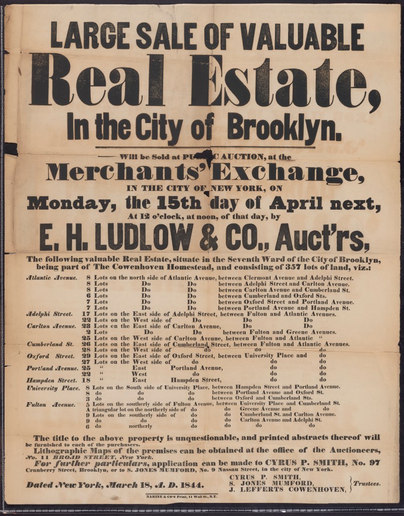 The estate offered lots from the Cowenhoven Homestead at an auction in Manhattan in April 1844. (Exactly 182 years ago!) But most of the homestead wasn’t picked up as individual lots. Instead, prolific Brooklyn real estate speculators of the era, like George S. Howland and William S. Packer, purchased the lots in bulk.