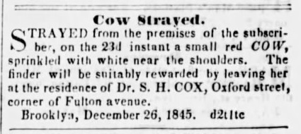 But this block, at least in the very beginning, DID have a distinctly rural flavor. The area was not yet even fully suburban, let alone the rowhouse block that it would soon become. So it’s not surprising to see this ad in late 1845 for a “Cow Strayed” from Dr. Samuel Cox’s residence on the corner. This was across the street from where Beach was just starting to build the house on Oxford Street.