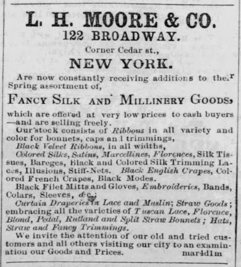 Leprelette Moore, like Beach, was a Manhattan dry goods merchant. Moore, his wife Elizabeth, and their four young daughters moved to Brooklyn from Nineteenth Street in New York. Moore’s Manhattan store was on lower Broadway, first at Beaver Street and later at Cedar Street. We can imagine Moore trading his commute by omnibus from the northern reaches of then-developed Manhattan, to one in Brooklyn involving the nearby Jamaica railroad to the South Ferry at the foot of Atlantic Street.