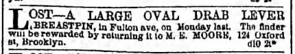 By 1856, the Moore family seems to have adopted the first house number on the block. The house became known as 124 Oxford Street. (Daughter Mary took out this “Lost & Found” ad in December using the new house number.) Before then, directories simply referred to houses on the block as “Oxford Street near Hanson Place.”